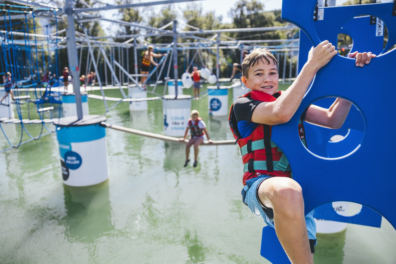 Erlebe in Deutschlands erstem Kletterpark über Wasser in sicherer Umgebung die Freiheit des Kletterns, wenn du dich von Hindernis zu Hindernis schwingst – eine Herausforderung für alle, die hoch hinaus wollen.