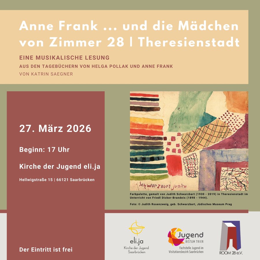 Katrin Saegner zitiert in ihrer musikalischen Lesung Passagen aus dem Tagebuch von Helga Pollak und stellt ihnen Auszüge aus dem Tagebuch der Anne Frank gegenüber. „Anne Frank … und die Mädchen von Zimmer 28 | Theresienstadt“ lässt so den Eindruck einer Verwandtschaft zweier Menschen entstehen, die sich nie begegnet sind, sich nie kennengelernt haben – und sich doch so ähnlich sind: in der Ernsthaftigkeit sich selbst und anderen gegenüber, im Tiefgang ihrer Gedanken … und in ihrer Sehnsucht nach dem Leben … nach dem Leben in Freiheit.